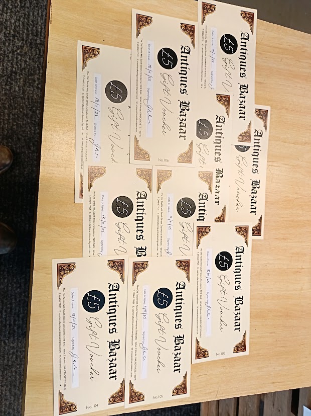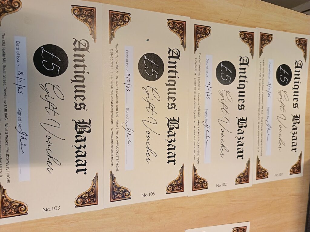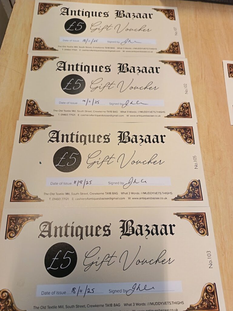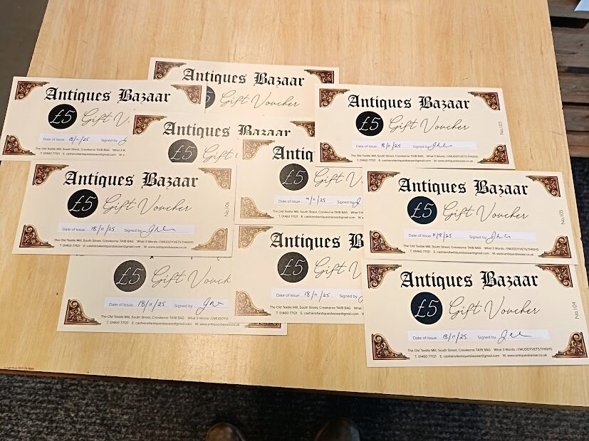 Our gift vouchers give you access to all items on sale here at Antiques Bazaar, South Street, Crewkerne, TA18 8AG, but must be redeemed before we finally close on 31 March 2026.